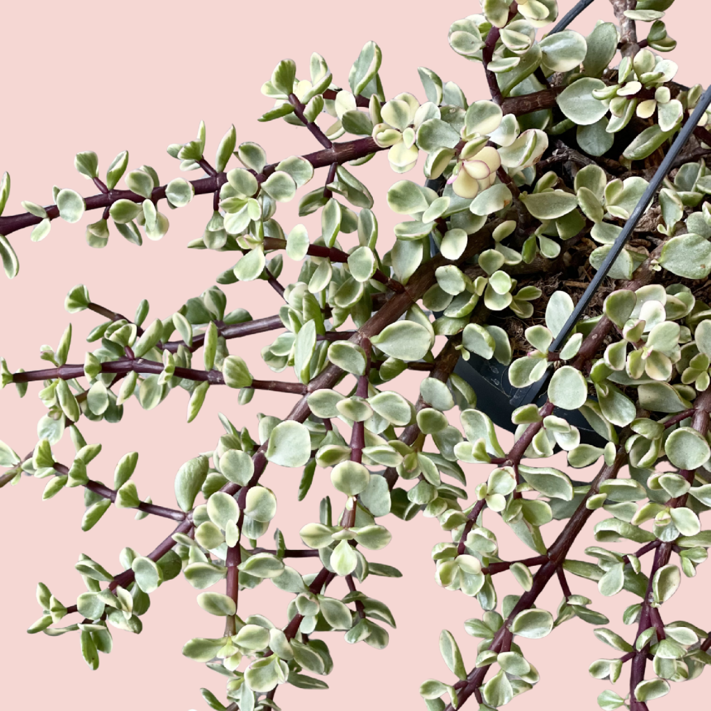 Crassula afra variegata je milý sukulent, ktorý v závesnom kvetináči krásne vynikne ako jemne ťahavá rastlina. Má drobné panašované lístky v kombinácii zelenej a krémovej farby, ktoré pôsobia veľmi sviežo a ľahko. Zaujímavým detailom sú aj jej fialové stonky, ktoré vytvárajú pekný kontrast s lístkami a dodávajú rastline ešte väčší šmrnc. Navyše je veľmi nenáročná – stačí jej veľa svetla a len občasná zálievka.