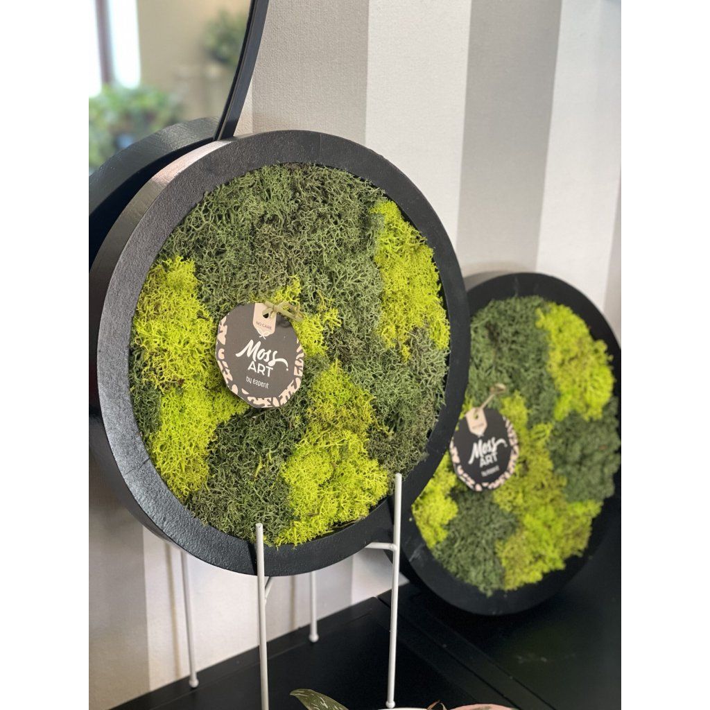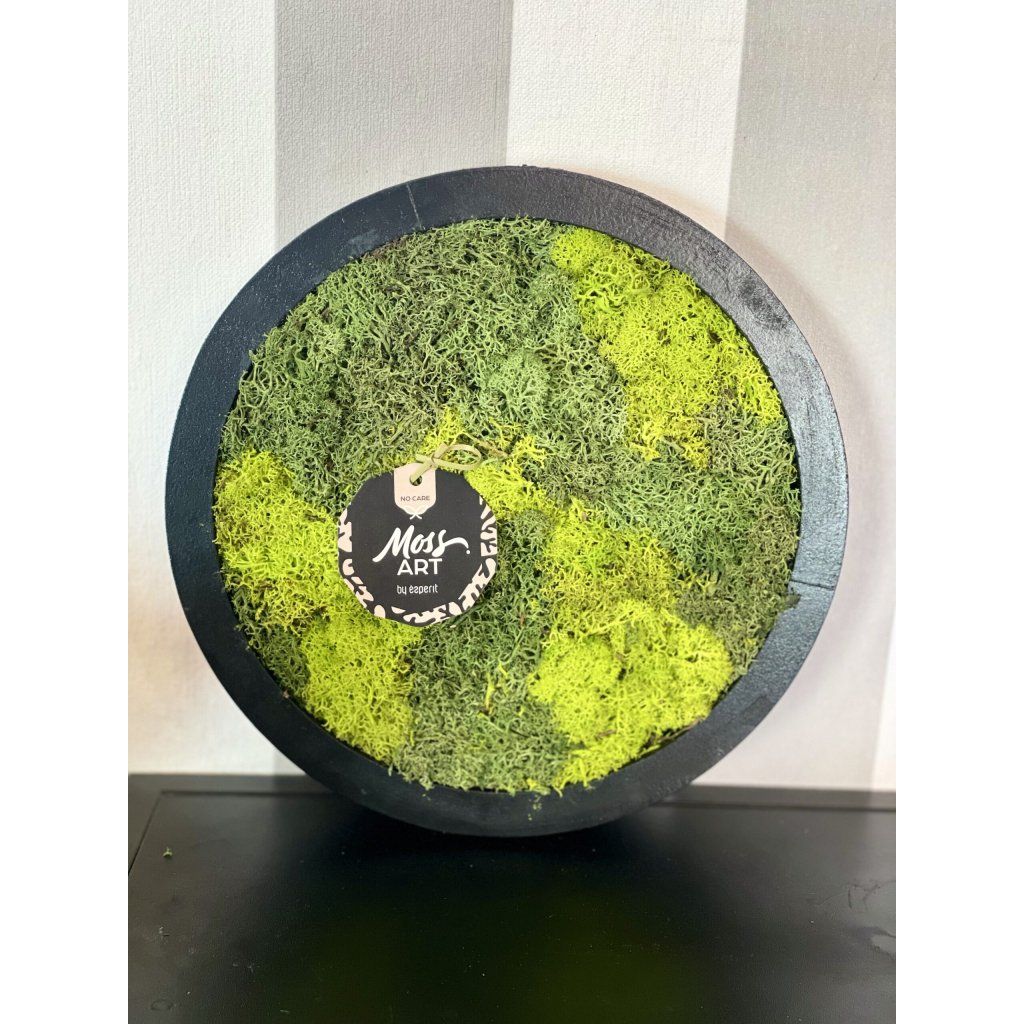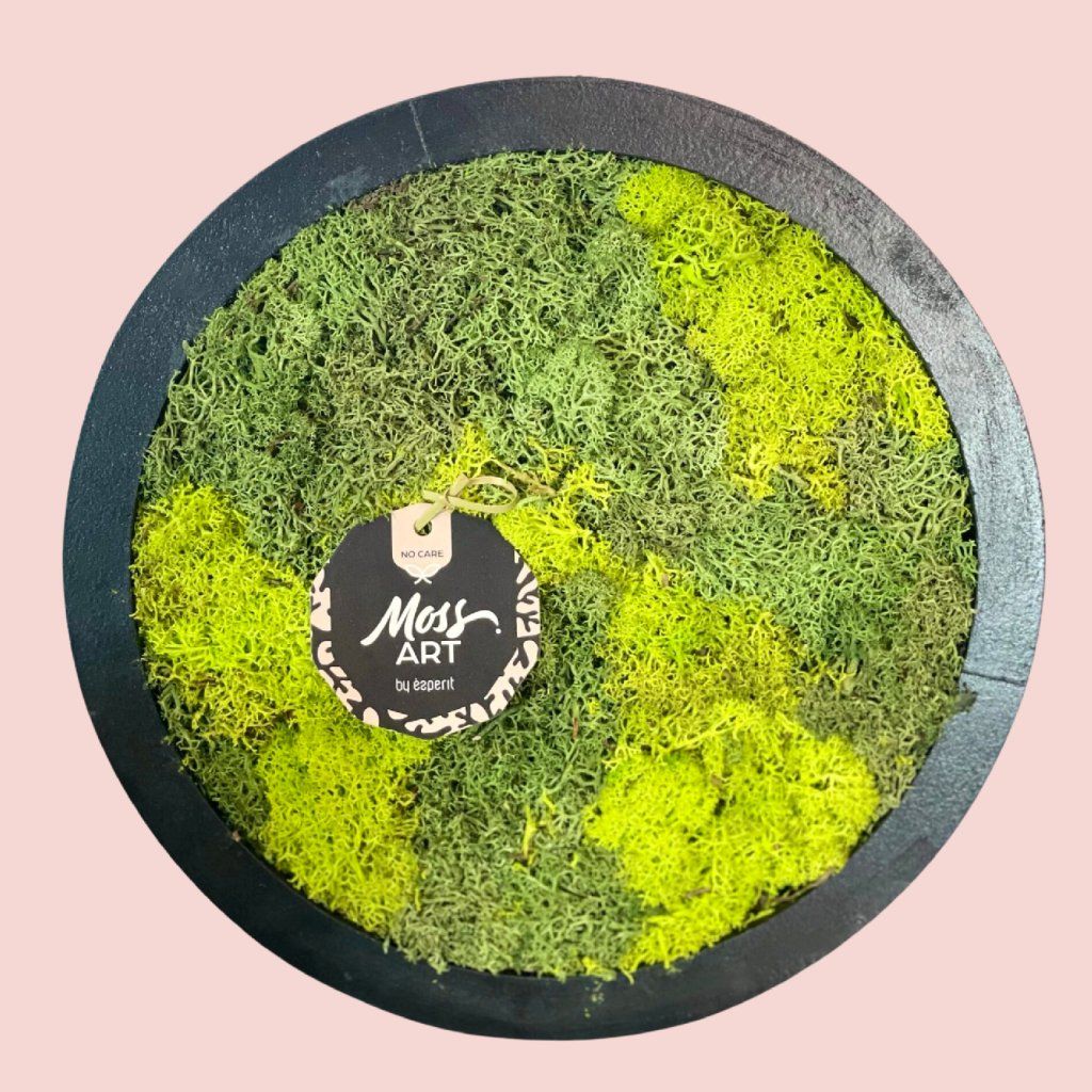 Machový obraz v tvare kruhu s priemerom 27 cm prináša do interiéru kúsok prírody bez akýchkoľvek starostí. Tento elegantný doplnok tvorí stabilizovaný mach – 100 % prírodný a ekologicky spracovaný tak, aby si zachoval svoj svieži vzhľad dlhé roky bez potreby polievania, strihania či špeciálnej starostlivosti. Stabilizovaný mach prechádza šetrným procesom konzervácie, pri ktorom sa jeho prirodzená vlhkosť nahrádza netoxickým, ekologickým roztokom. Výsledkom je trvalo krásny, mäkký a žiarivo zelený povrch, ktorý nevädne ani nežltne.